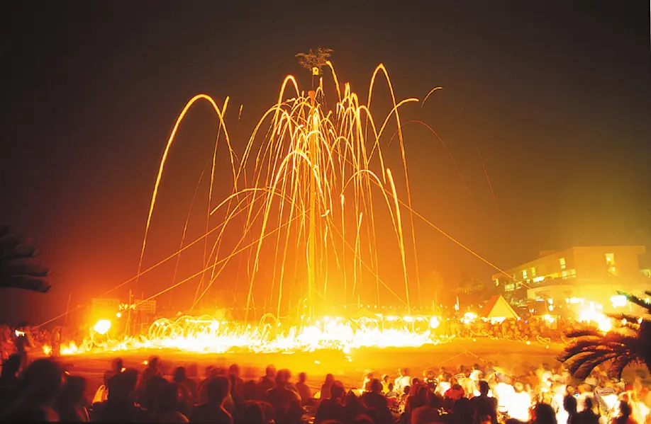 The festival, a ceremonial event that’s based on a historical legend where a local monk killed a feared serpent using a torch, involves the thrilling act of repeatedly tossing fireballs into a pine tree that has been wrapped up to symbolize the serpent—eventually igniting a cascade of fireworks.