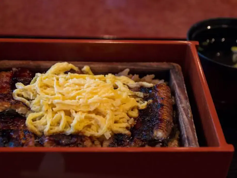 Once you're hungry enough for an actual meal it's time for eel, Yanagawa's traditional dish. Unagi no seiro-mushi is a bowl of rice mixed with sweet sauce, topped with juicy steamed eel and thinly sliced egg.