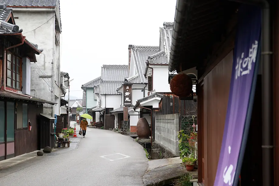 The picturesque townscape is designated by the national government as a preservation area of important traditional architectures. Incoming tourists disembark at the rustic train station – Hizen-Hama Station – and from there, under the visage of scenic Mount Taradake, it is a short, approximately 6-minute walk to Sakagura-dori.