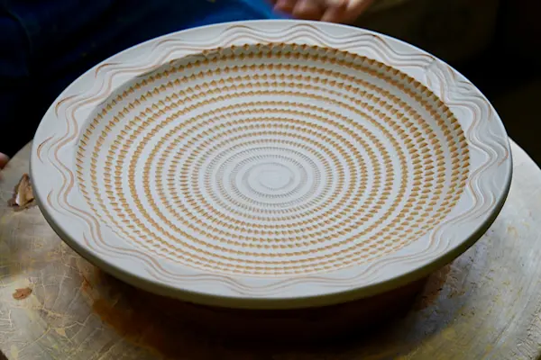 Ota-san holds a small flat rod in one hand as the dish spins steadily around the wheel between his legs. Within seconds, a chattered spiral of toothlike incisions appears through the white slip on the wet plate. This is tobikanna, one of the most characteristic patterns of Koishiwara pottery.