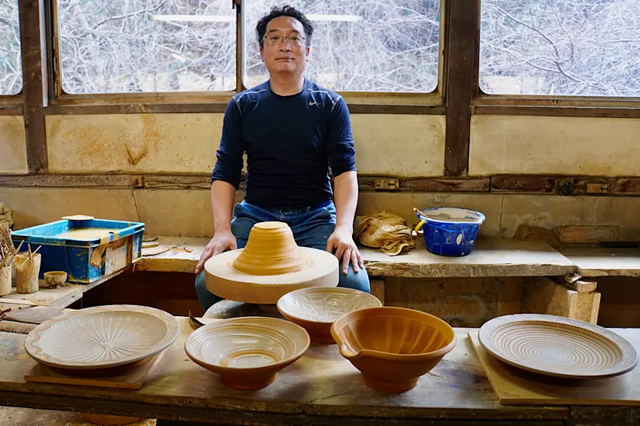 I visit Marudai kiln, nestled in the mountains not far from the famous Gyoja Cedar forest. Ota Kazuya, a 15th-generation Koishiwara potter who married into his wife’s Marudai household, has everything he needs on his property within a few steps of his family home. His studio is the size of a barn, with large windows framing dry branches behind him, makeshift furniture, and shelves of drying bowls and dishes.