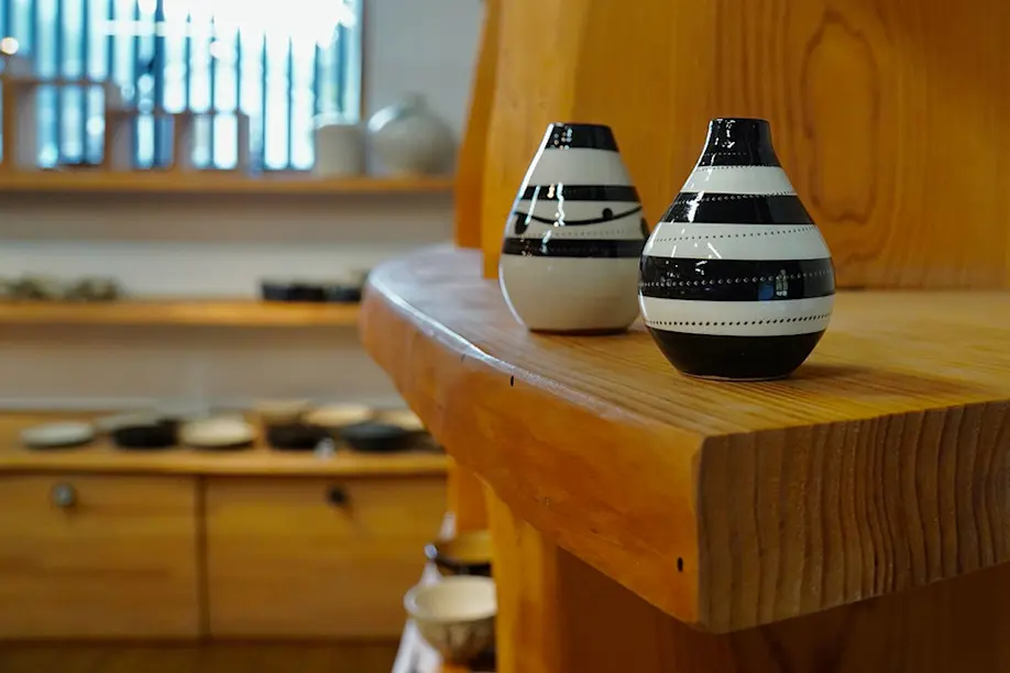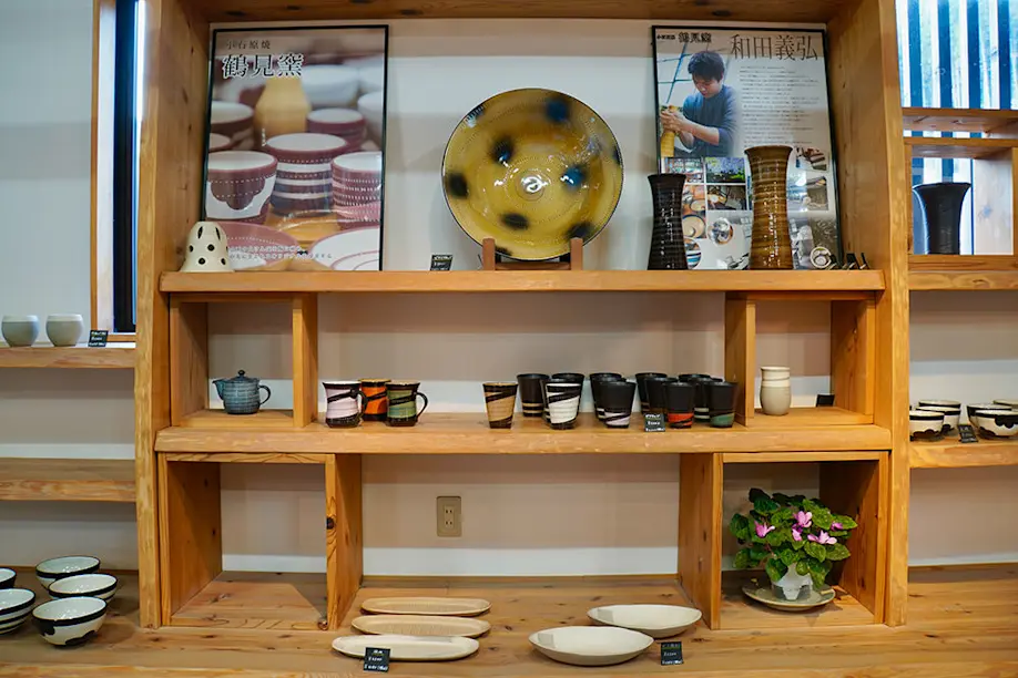 Almost as impressive as Marudai’s climbing kiln is their family house, tea room, and shop, all in a traditional building constructed with a thatched roof and tied beams in the artisanal gassho-zukuri architectural style. Inside, dainty teacups are exhibited alongside giant pots and vessels, as if in a living museum. The shop displays affordable kitchenware items, with a central table highlighting wares fired in the noborigama.