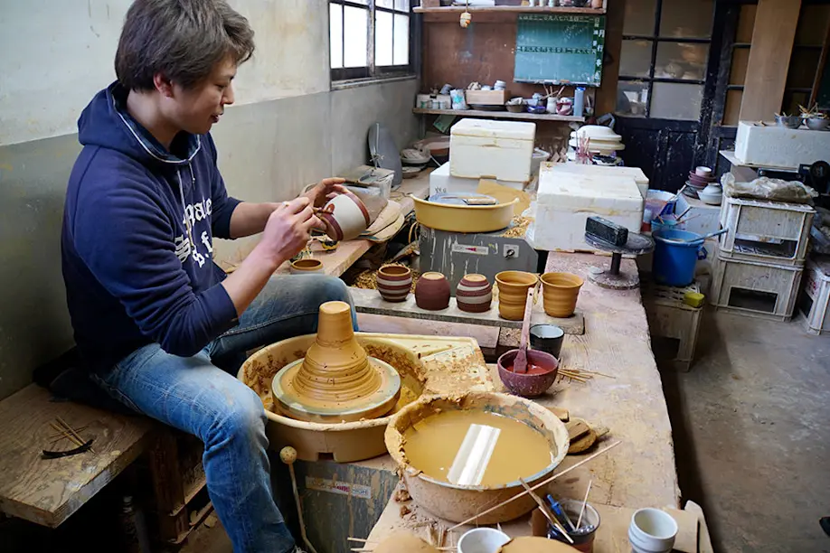 In his early forties, Tsurumi’s master potter is Wada Yoshihiro, a good-looking, style-conscious, second-generation Koishiwarayaki craftsman who also studied at a traditional crafts school in Kyoto. His hands are just as deft at throwing the clay at the wheel, but his forms and designs are notably more contemporary.