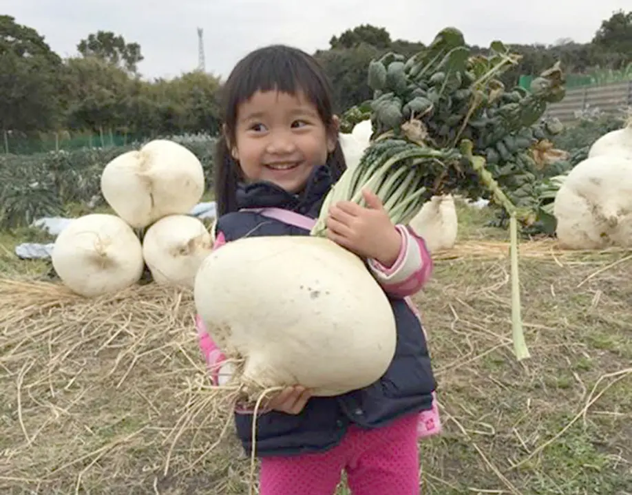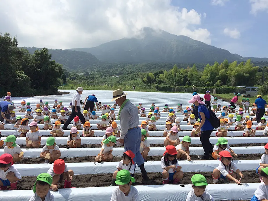 Since the year 2000 Mr. Murayama has opened part of the field to green tourism, and he offers it as a place for local kindergarten children and general customers to experience sowing Sakurajima daikon seeds and harvesting the daikon as well. In addition, he is registered as a WWOOF host and he also accepts agricultural trainees from overseas. “Every year at the beginning of December we also have a Sakurajima komikan harvesting experience. After harvesting, we can have lunch on the Sakurajima daikon field whilst enjoying the view of Kita-dake,” says Tomomi-san. It is a precious opportunity where we can indulge our five senses in the attraction of Sakurajima by coming close to the verdant carpet of the leaves of Sakurajima daikon that extend over the field.