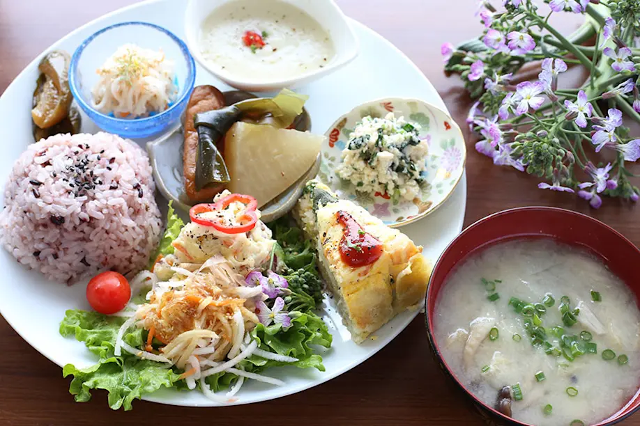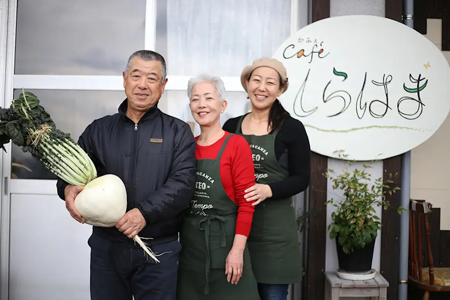 Sakurajima daikon seeds are sown from August to September, and harvesting can be done the following year from January to February. The daikon grows over approximately half a year, double the cultivation period of a normal daikon. The cultivation of Sakurajima daikon would also be possible outside the island but “The taste would definitely not be the same,” says Mr. Murayama. “Because the soil being volcanic ash, we can grow a firm-bodied daikon with a soft texture but powerful sweetness. Sakurajima daikon is the very manifestation of the volcano’s blessings.” In the spring of 2013, his wife Akie said “I want to create a spot where we can introduce people to the deliciousness of Sakurajima daikon and the attractions of the Sakurajima peninsula,” and this led to her opening the seaside coffee shop “Cafe Shirahama” with her daughter Tomomi on the shore of Sakurajima. One of the most popular offerings is the “One Plate Lunch” which changes daily and contains copious amounts of homegrown organic vegetables and fruits, and from the middle of January to the middle of February, you can also savor cuisine that makes complete use of all the parts of a Sakurajima daikon. The root is used for steaks and namasu style (seasoned in vinegar) dishes, the leaves are used for shiroae (salad dressed with tofu, white sesame, and white miso) and as ingredients for miso soup, and the cute, light pink flower is used for salads. On seeing my surprise at the variation of Sakurajima daikon cooking arranged colorfully on the plate, Mr. Murayama’s daughter Tomomi explains “A characteristic of Sakurajima daikon is that when you cook it, it absorbs the flavors quickly, and even when you cook it to a melt-in-your-mouth softness it doesn’t fall apart at all. It also goes well with Western dishes like potage and quiche.”