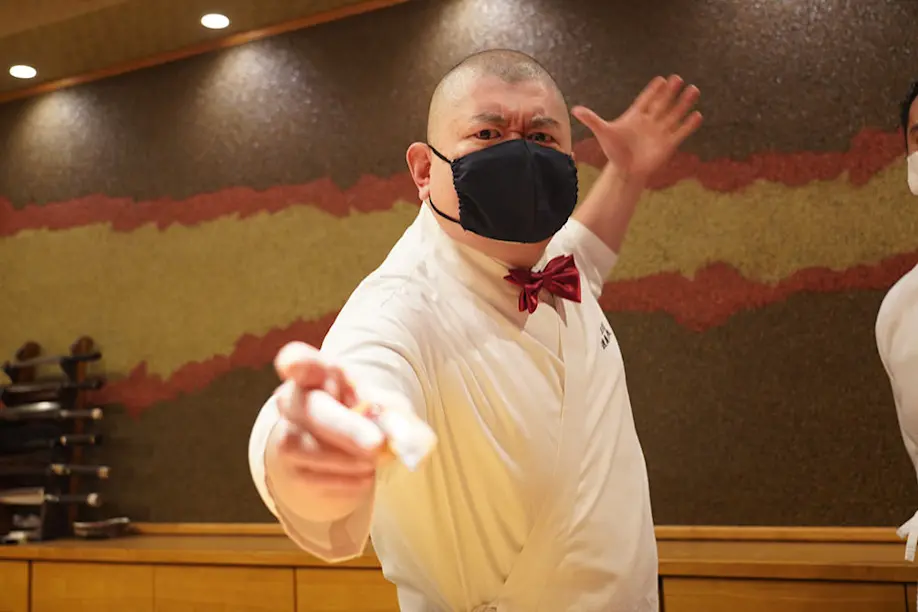What makes Watanabe such a rising celebrity in the world of sushi is his own personality and how he pairs it with the outstanding food he prepares every day. A lifelong and accomplished student of the judo martial art, Watanabe has an impressive frame that pairs with his enthusiastic tone to create a uniquely lively environment. On top of that, it is Watanabe's custom to present each freshly-made piece of signature sushi to diners by balancing the sushi on the middle two fingers of his left hand and stretching it out for them to take it.