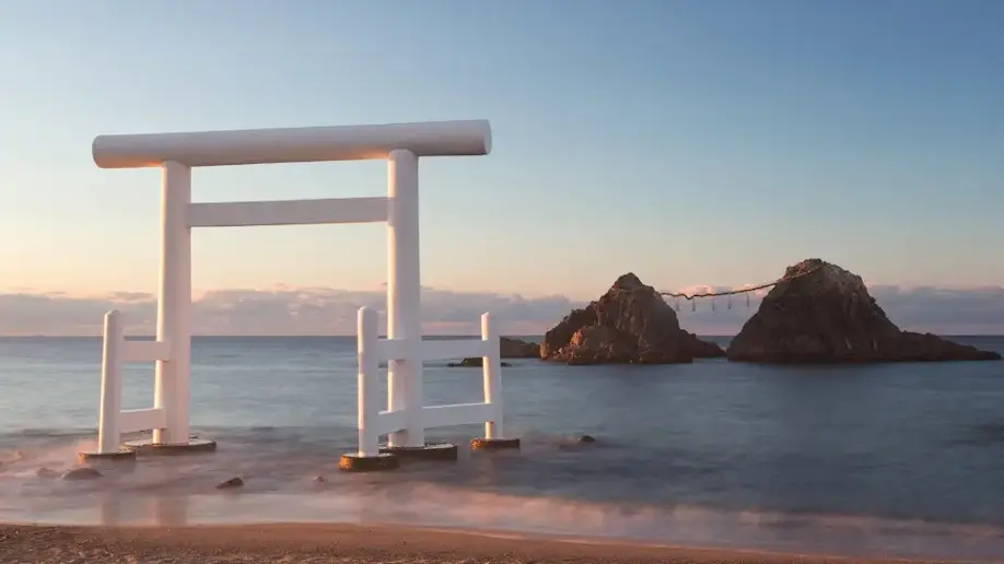 Located in the northern part of Kyushu in southwestern Japan, Itoshima is a peninsula known for its sandy beaches, lively surf scene, crimson sunsets, and fascinating natural structures. It is also near the Fukuoka urban area, where travelers can enjoy numerous activities and culinary delights including cafes, oyster stalls, and sushi. One of the most well-known, found on Sakurai Futamigaura beach, are the two rocks of Meoto Iwa, connected by shimenawa, a sacred straw rope, and framed by a white torii gate. The giant shimenawa weighs approximately one ton and requires more than 50 men to carry it out to the rocks when it’s replaced each year during the spring tide. It’s easy to see why these are often called the “wedded rocks” or “husband and wife rocks,” as they give the impression of two people closely connected.