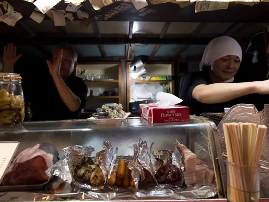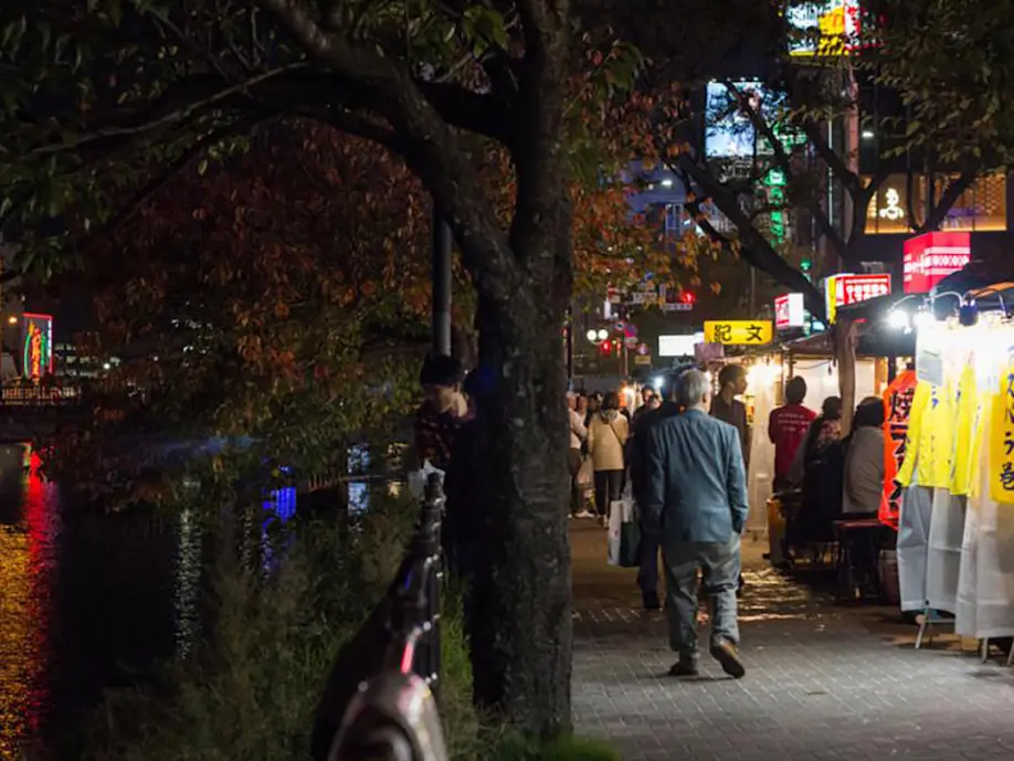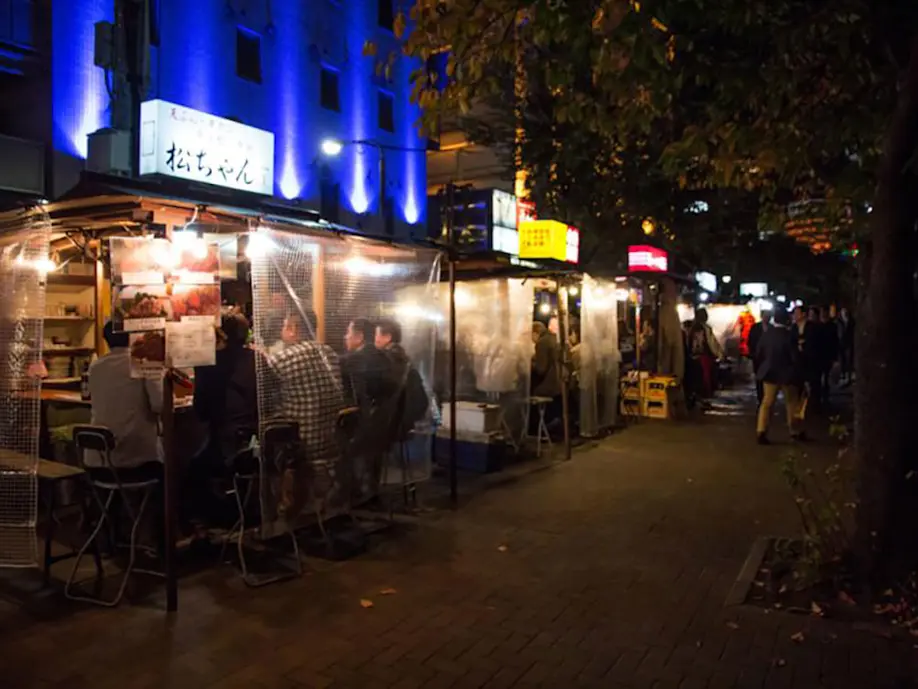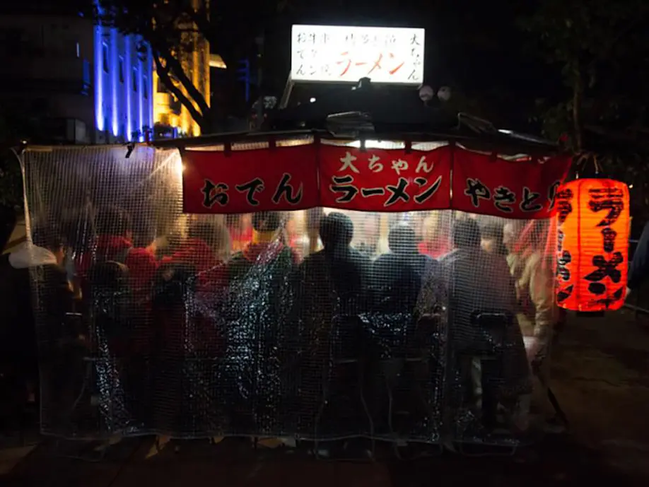 The sun sets over the city of Fukuoka and slowly, people in aprons come out pulling old wooden carts. Reaching their spot, they open up the cart to reveal a miniature restaurant: a counter with seats, glass cases for food and portable refrigerators. The sound of electric generators fills the air as hungry patrons start occupying the seats.