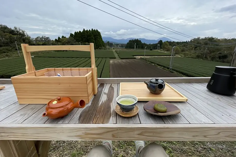 The journey starts at Kagoshima Airport. Kagoshima Airport is located at the foot of the Kirishima Mountain range, the place you will be visiting. You may have seen the Kirishima mountains from the plane window. After arrival, you will take a private car to a tea farm. The Kirishima Mountains are large mountains, but they provide abundant and clean water to the places where people live. This water can be used to grow many agricultural crops. One of these is tea. It is exported to the rest of the world under the brand name Kirishima Tea. This time, visitors can make their own Matcha on a terrace deck built in the midst of the tea fields. The Kirishima mountains lie in front of you. The taste of the tea while looking at the scenery is exceptional.