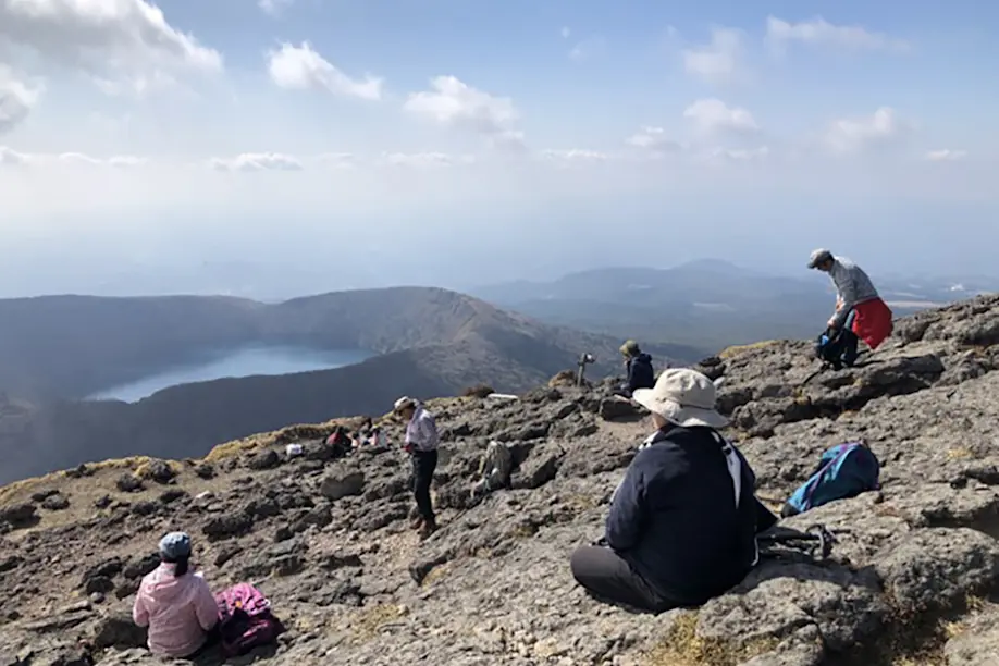 Today the main activity is climbing the mountain, but you will cycle to the trailhead by e-bike. You will start the climb at the Ohnami Pond trailhead. Ohnami Pond is a nearly circular crater lake with a diameter of 630m and a circumference of approximately 2km. A 40-minute ascent takes you to a spot where you can get a bird's-eye view of the lake. From here, walk along the mountain ridge path looking down on the pond. The pond shows various aspects from that direction.