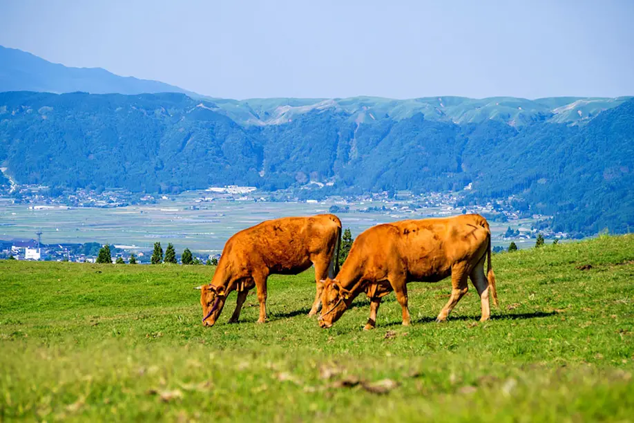 The bokuya is normally off-limits to the general public, but due to changes in farming styles and a lack of successors to maintain the grasslands, several organizations have taken the initiative to offer guided tours introducing visitors to Aso’s bokuya culture and heritage. And what could be more fun than immersing yourself in this volcanic landscape on electric mountain bikes? As soon as I see the rolling carpets of vibrant summer grass stretching out in all directions, I can’t wait to jump on an e-bike and ride off-road into the horizon. Of course, I first confide my trust (and my safety) in our dedicated bokuya guide – a former captain of a firefighting mountain rescue team who is driven by his desire to contribute to the conservation and sustainable use of the local landscape.