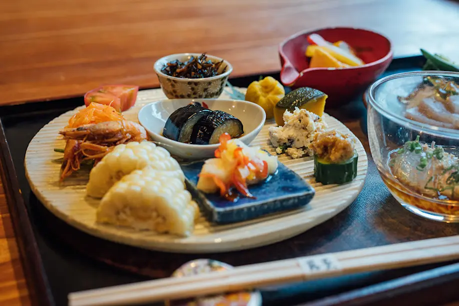 Right next door, the stylishly traditional Japanese inn Ryoan Fukinotou was started by a local resident who originally served her own vegetarian cooking at Fuki-ji. Both dinner and breakfast are flawlessly presented with an emphasis on the local ingredients of Oita’s fertile Kunisaki Peninsula. The chef, a young monk who is one of the primary caretakers of the temple, is also the instructor of the on-site Zazen experience.