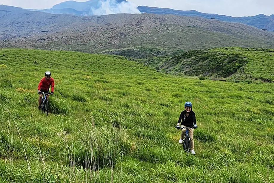 At last, I cycle across the rejuvenated grasslands on a thrilling ride of rolling hills and diverse terrain, which the mountain e-bike handles with ease and grace. Along the way, we spot wild boar holes, deer bones, rare plants, and other native wildlife that is lucky to inhabit this lovingly protected landscape of the Aso Caldera.
