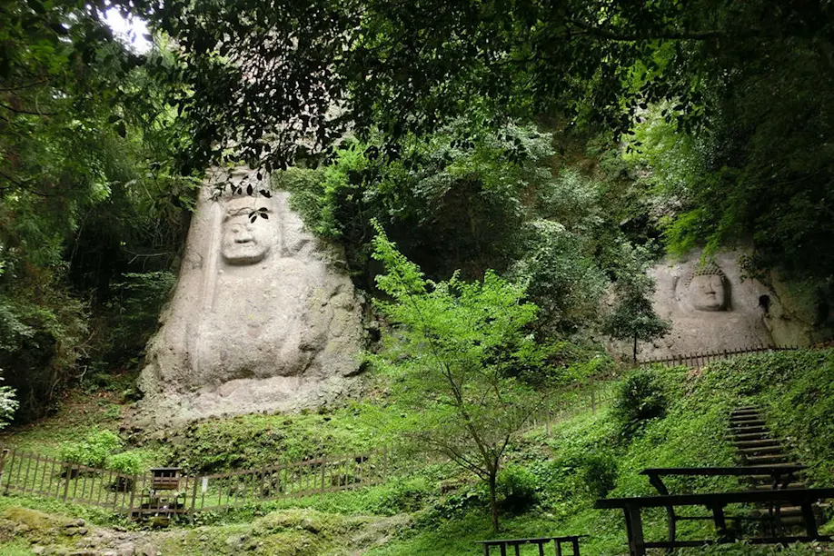 I now stand before a finely carved Dainichi Nyorai, the supreme deity of Esoteric Buddhism in Japan, and at the gently frowning 8-meter-high Fudo Myo-o, one of the largest Buddhist statues in Japan from the Heian and Kamakura periods. I can only imagine the statue's original appearance, representing Fudo Myo-o’s typically ferocious “immovable” character and fanged growl, which the centuries have softened into a more gentle frown. The dark gray, porous cliffside upholding these forms is a conglomerate of hard bedrock and volcanic tuff accumulated over eons.