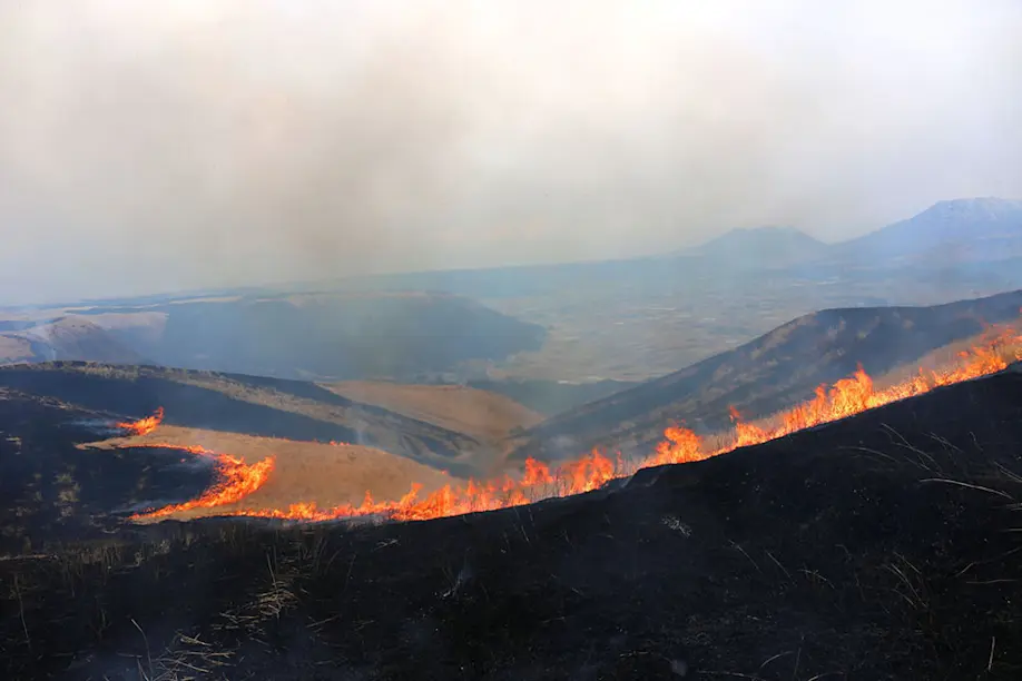 In fact, humans have lived in harmony with the Aso volcano since ancient times. As rainfall filters through the volcanic strata over several decades, high-altitude forests and grasslands store mineral-rich spring water, which can be used for both drinking and irrigating farmland. Farmers use the grasslands created by nutrient-poor earth mixed with volcanic ash for grazing horses and cattle, enriching the soil with their manure. Today, the sprawling verdant grasslands, known as bokuya in Japanese, extend over an area of about 22,000 hectares.