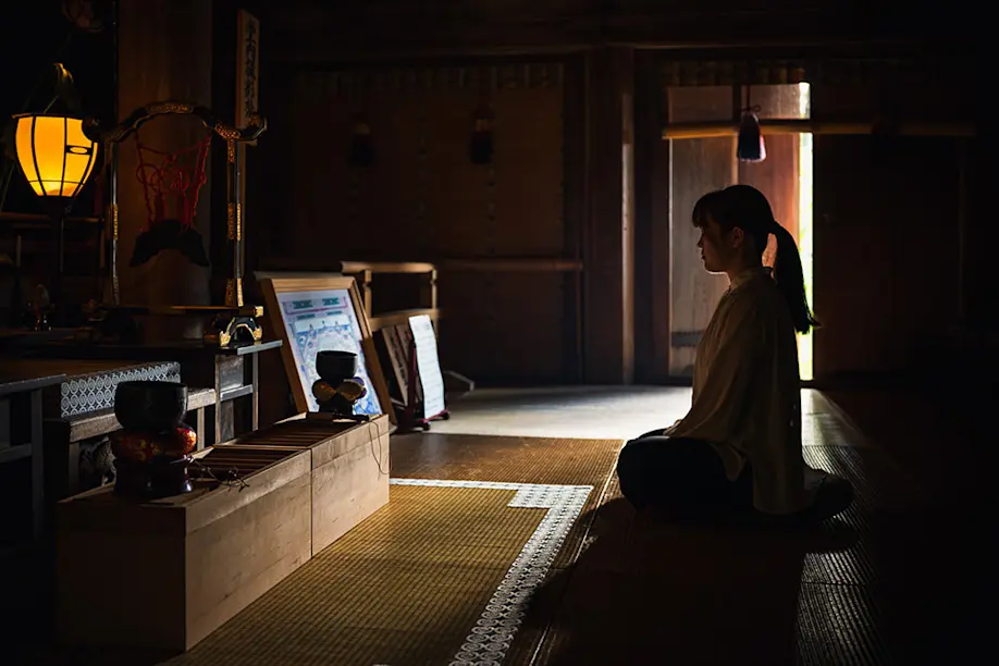 The next morning, inside the Fuki-ji temple hall, we learn the core practice of Tendai Zazen meditation, which is to become aware of your existence by counting your breaths without manipulating the pace. The breathing brings you to a relaxed state; the counting keeps you focused. This is done in the dark stillness of the temple, facing the Amida Nyorai, which is bathed in a golden aura by a sliver of sunlight. Behind the Amida Nyorai is an ancient mural representing the Pure Land of the Tendai sect upon which the syncretic religion of Rokugo Manzan was founded.
