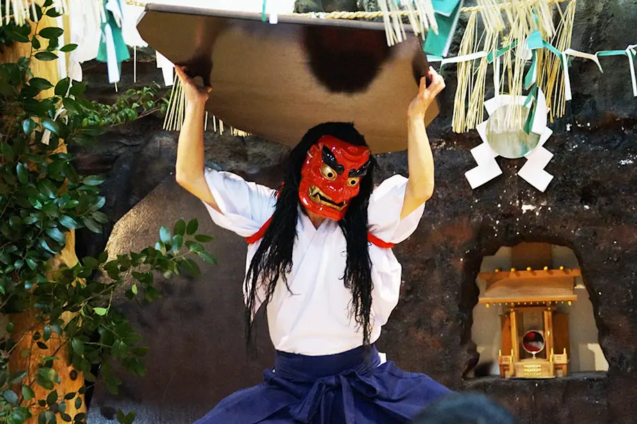 After nightfall, I head to Takachiho Shrine to catch a special performance of Takachiho Kagura: a lively traditional performing art to express gratitude for the autumn harvest and pray for future prosperity. The Kagura dances represent the leading four dances of Takachiho-no-Yokagura, dedicated to the local guardian deity Ujigami-sama, based on Amano Iwato mythology. I marvel over this evening cultural spectacle of dramatic masks, bright costumes, traditional taiko drums and melodic bamboo flutes, which paints a rich and enduring portrait of this legendary area.