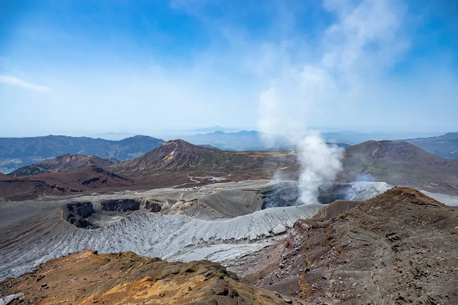 Finally, I drive to the volcanic heart of Kyushu: the Aso Caldera. Formed by a volcanic eruption between 270,000 and 90,000 years ago, this huge crater, measuring 18 kilometers from west to east and 25 kilometers from north to south, is one of the largest calderas in the world. The Aso Caldera is also home to some 40,000 people who live within the world’s only stable settlement within a caldera, which even includes a main road and railroad.