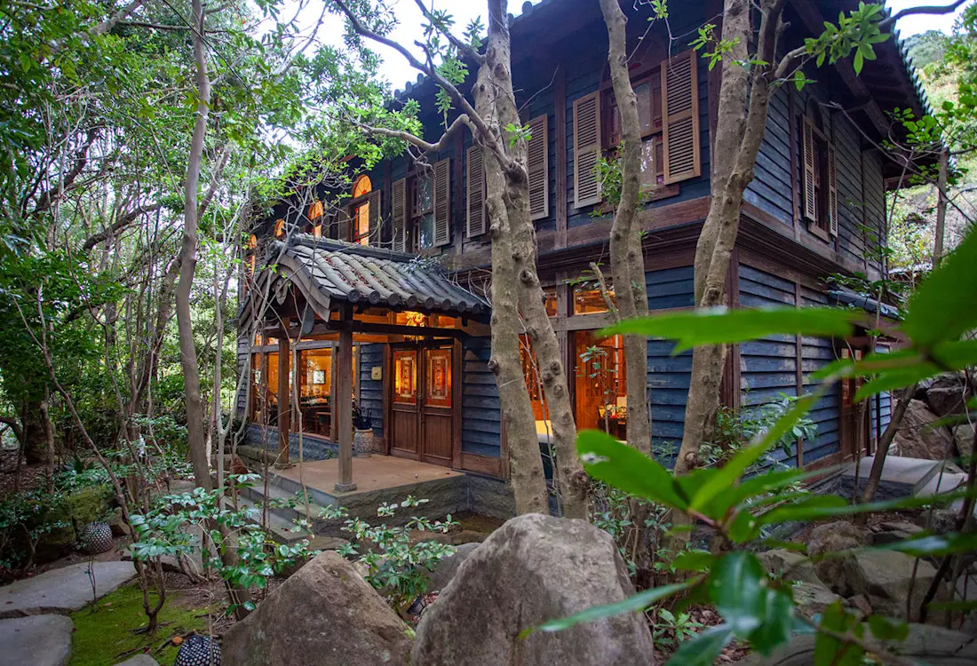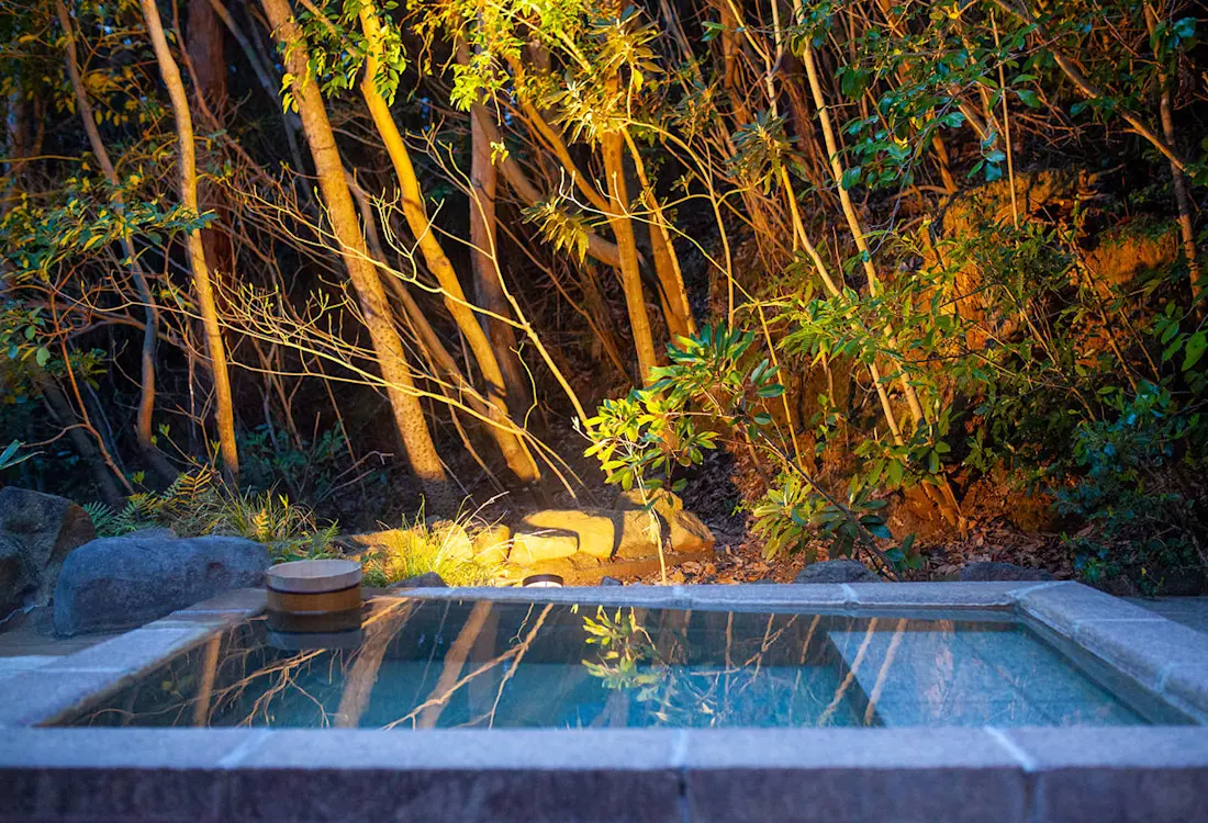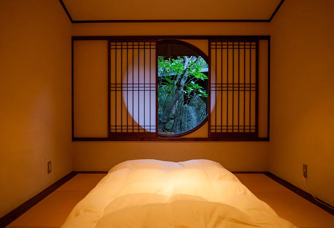 The Gosoku no kutsu ryokan in Amakusa, Kumamoto Prefecture, is located in Kumamoto's Unzen-Amakusa National Park and is a top-rated spot to view the sunset over the sea. 15 detached guest rooms allow you to relax and enjoy the open-air bath dedicated to your room while watching the sunset before your eyes and the star-filled night sky. Shimoda Onsen, where Gosoku no Kutsu is located, is also a fishing town, where guests can enjoy kaiseki cuisine featuring fresh local fish. In the 16th century, Amakusa was the place where Japan met Europe and was introduced to various Western cultures as well as Christianity. The oriental space of the Gosoku no kutsu represents this historical fusion of Amakusa and the West.