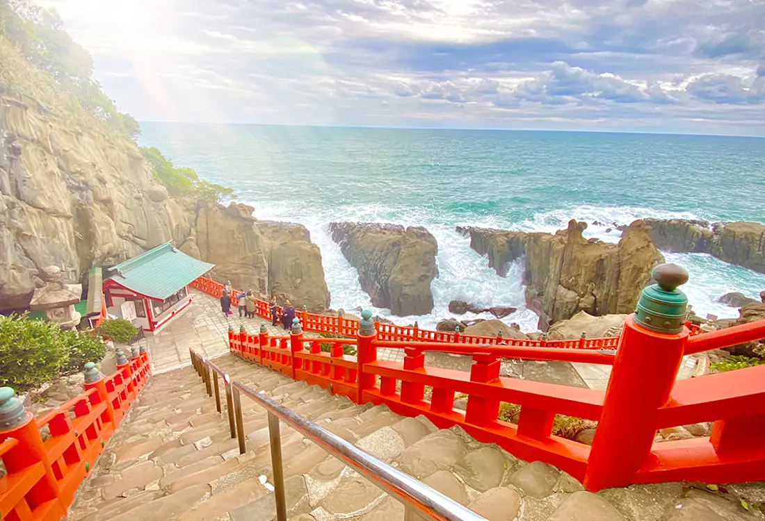 Udo Jingu is a truly unique shrine that should definitely feature on your itinerary when visiting Miyazaki. It's located along the Udozaki coastline and is actually built within a cave overlooking the ocean and some unusual rock formations. With its impressive vermilion-red architecture, the shrine is dedicated to Ugayafukiaezu no Mikoto, a Shinto god from the region. The shrine is believed to have powers over fertility and safe childbirth as well as harmonious romantic relationships. In addition to the typical rituals when visiting a shrine, visitors can throw "undama" (a ball-shaped clay stone) into the rocks below. It's believed that if you hit the target, your wishes will come true!