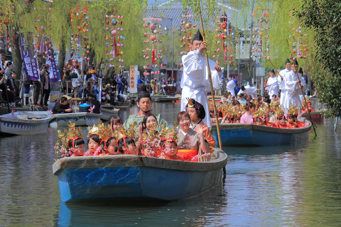 Yanagawa, about an hour to the southwest of Fukuoka, is famous for its network of canals, originally used for irrigation and to create a moat around the town's castle. Exploring the canals on a small punt boat (donkobune) is a charming way to see the town. The boatmen often share stories and folksongs along the way. Standard tours last around 1 hour and depart from one of the six stations around the canals. At the last boat station, Ohana, you can visit the residence and gardens of the Tachibana family, who once ruled the area. The house was built in 1910 in a grand European style, with traditional Japanese gardens. There are restaurants, a museum and a hotel on the grounds.